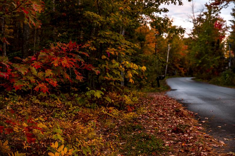 Autumn colors on a lakeside neighborhood road in Old Town, Maine.